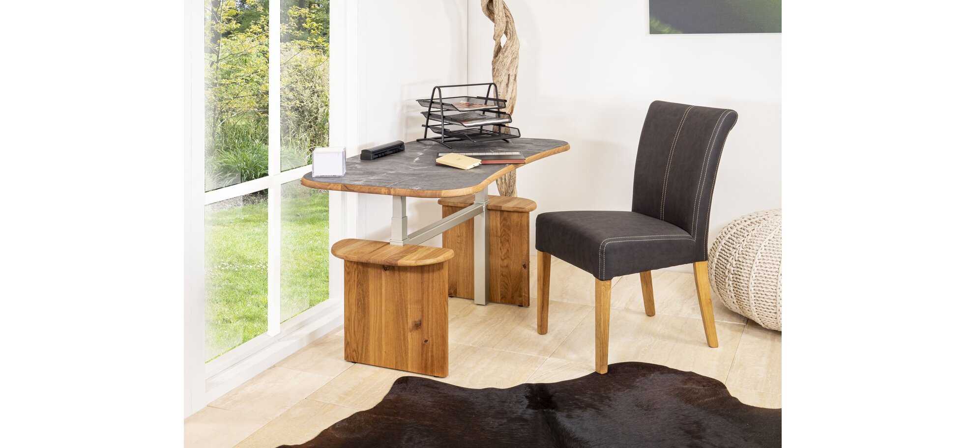 Platte HPL Dunkelgrau auf Massivholz;Gestell Wildeiche massiv geölt;Metallteile persilberfarbig lackiert;höhenverstellbar mit Lift Mechanik;LBH: ca. 120x70x54-82 cm