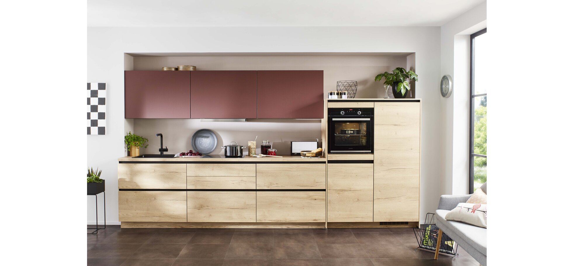 Puristische Schönheit mit XL Stauraum Rostrot und Eiche setzen in dieser Küche einen spannende Akzent. Gemütlich einerseits, modern andererseits. Das kompakte Stauraumwunder lässt keine Wünsche offen, wenn es um funktionales Kochen und ästhetischem Anspruch geht. geräumig und offen im Design inkl. Abzugshaube 80 cm Korpushöhe intelligente Stauraumlösungen in XL Format Hängeschränke mit rostroten Fronten Kompakt, aber trotzdem Raumwunder? Das geht mit der Erhöhung des Korpus auf 80 cm. Um 10% mehr Stauraum geniessen zu können. Das bedeutet für Sie: mehr Platz für Utensilien und mehr Platz für Kochfreude. Komplett ausgestattet mit allen Elektrogeräten, die Sie in einem Küchenleben brauchen. Inklusive der Flachschirmhaube, die sofort alle lästigen Kochgerüche beseitigt und unter dem Hängeschrank kaum sichtbar ist. Sie sehen: diese Küche bringt alles an inneren Werten und Ästhetik mit, die aus einem Küchentraum Wirklichkeit macht.