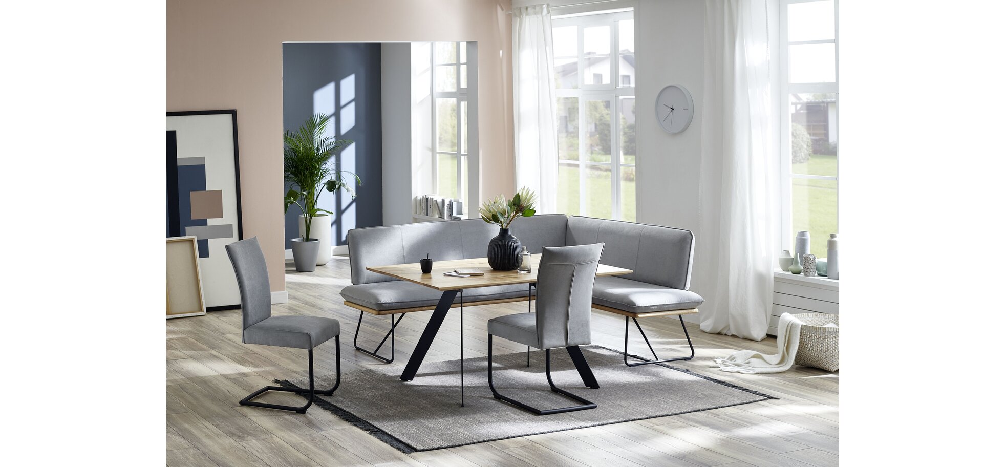 Modern und leichtfüßig in der Optik und mit bequemen Sitzkomfort eignet sich die Eckbankgruppe für moderne Essplätze. Schwarze Drahtkufe, Spitzkissenoptik und eine umlaufende Holzleiste bestimmen den Charakter der Eckbank. Mit massiver, schmaler Tischplatte in Eiche und elegantem schwarzen Gestell schmiegt sich der Design Esstisch elegant dazu. Komplettiert wird die Gruppe mit einem passenden Freischwinger. Zwei Größen stehen Ihnen beim Tisch und in der Eckbank zur Verfügung. Graphit oder Platingrau können als Bezugsfarbe gewählt werden.